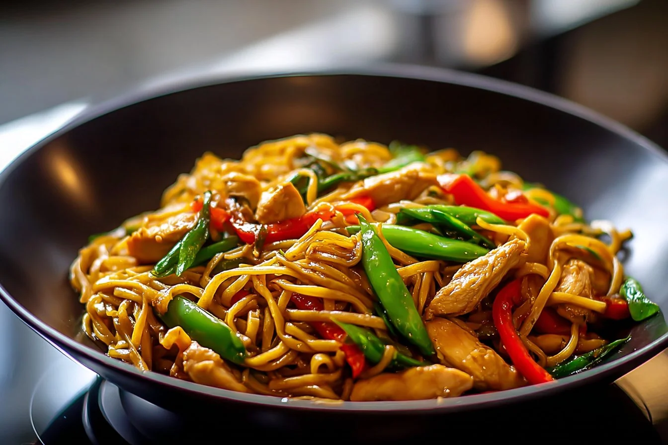 A quick and delicious dish featuring tender chicken, colorful vegetables, and silky noodles in a savory sauce, perfect for busy nights.