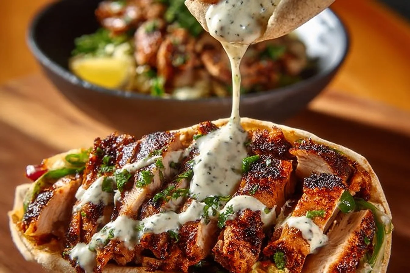 A flavorful Middle Eastern dish featuring tender chicken marinated with spices and served with a creamy garlic sauce in pita bread.