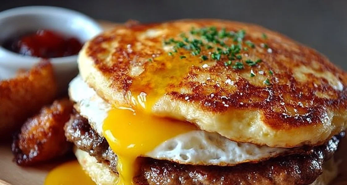A quick and customizable breakfast sandwich featuring fluffy pancakes and savory fillings.