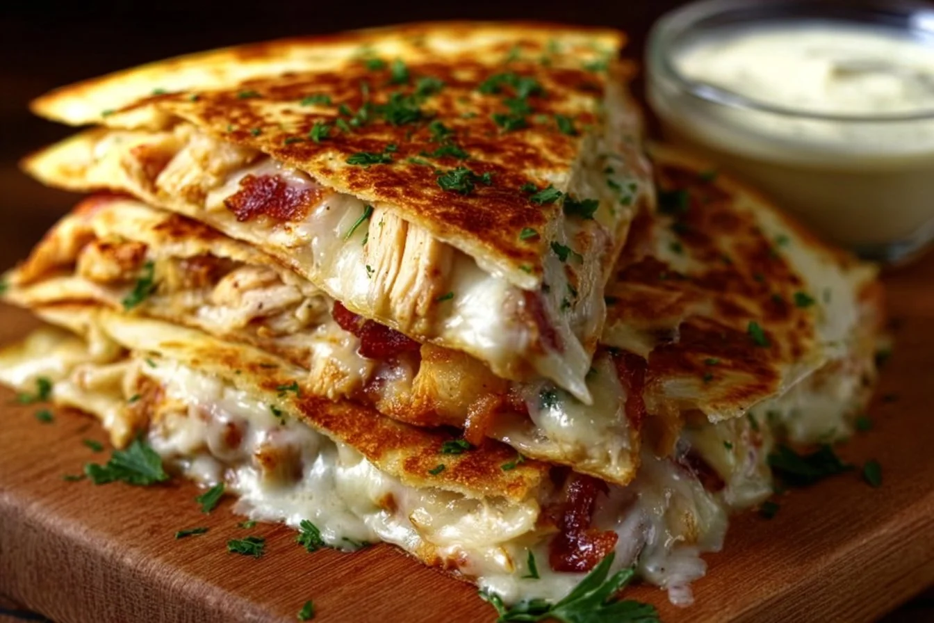 A delightful quesadilla filled with savory chicken, smoky bacon, and zesty ranch dressing, all wrapped in crispy tortillas. Perfect for family gatherings!