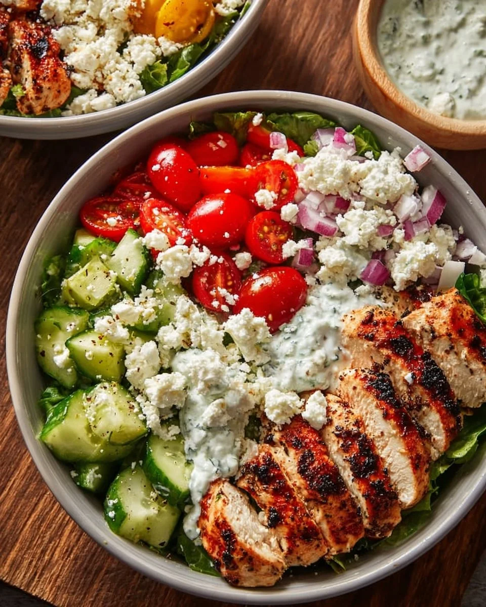 - Assemble the bowls by adding a base of chickpeas, then topping with sliced chicken, fresh veggies, feta cheese, and a dollop of tzatziki sauce.