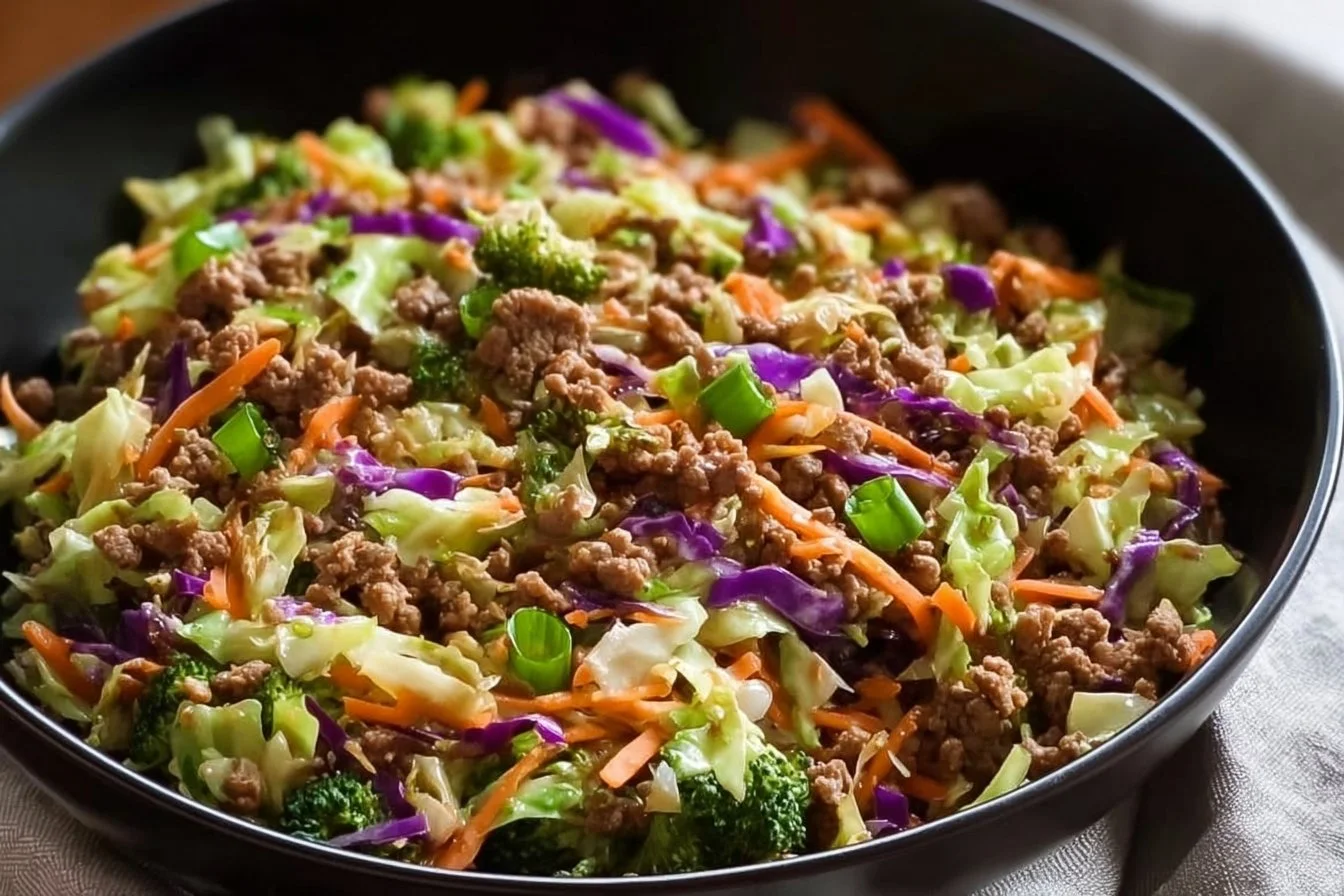 A cozy and quick dinner packed with protein, featuring ground lean protein and a flavorful coleslaw mix.