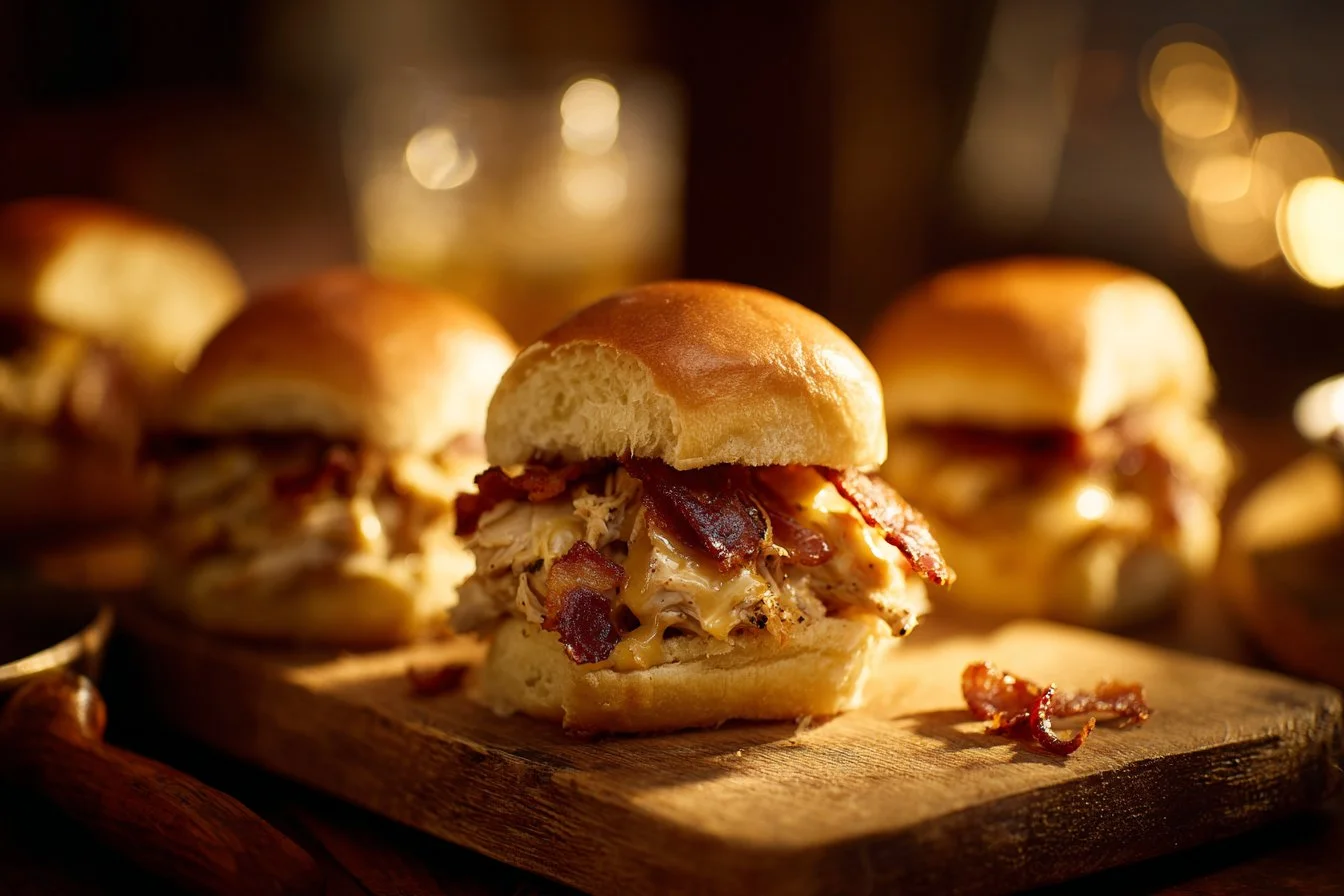 Delicious sliders featuring savory chicken and crispy bacon drizzled with sweet maple butter, perfect for any gathering.