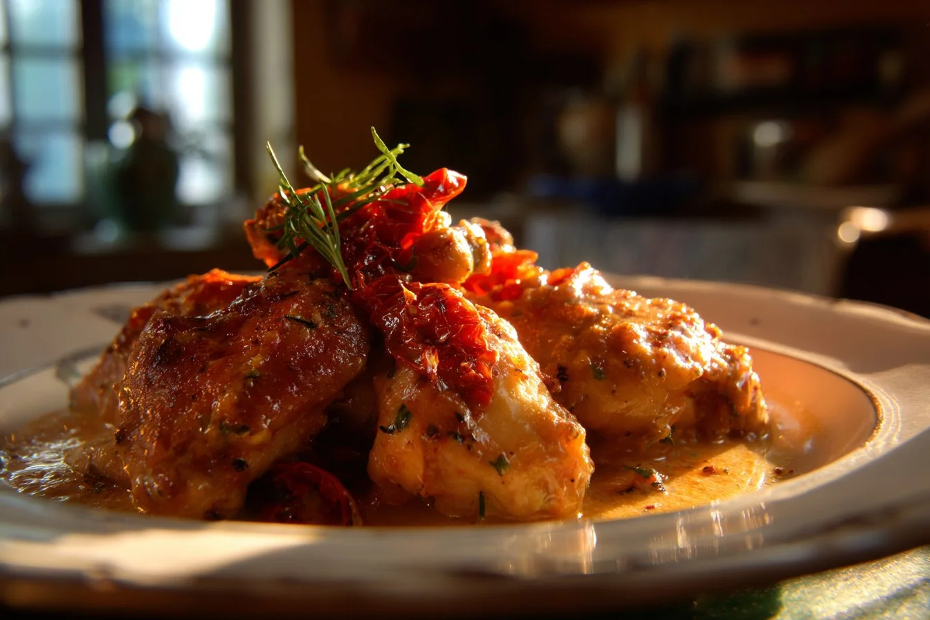A delightful dish featuring tender chicken in a creamy sauce with sun-dried tomatoes and Parmesan, perfect for a romantic dinner or family meal.