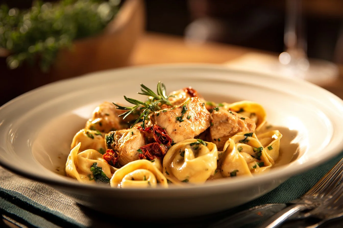 A delightful dish combining tender chicken, creamy sauce, and flavorful tortellini that creates a heartwarming experience.