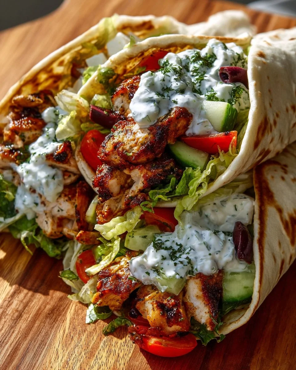 A delightful recipe for Mediterranean chicken gyros featuring marinated chicken, fresh veggies, and a creamy feta tzatziki sauce.