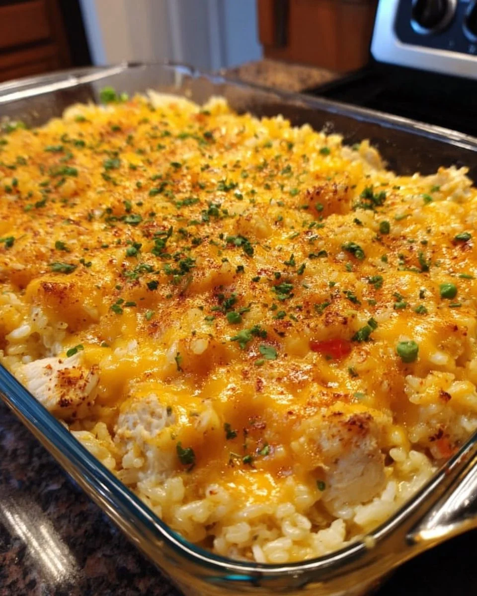 A warm and filling chicken rice casserole made with simple ingredients, perfect for busy families or potlucks.