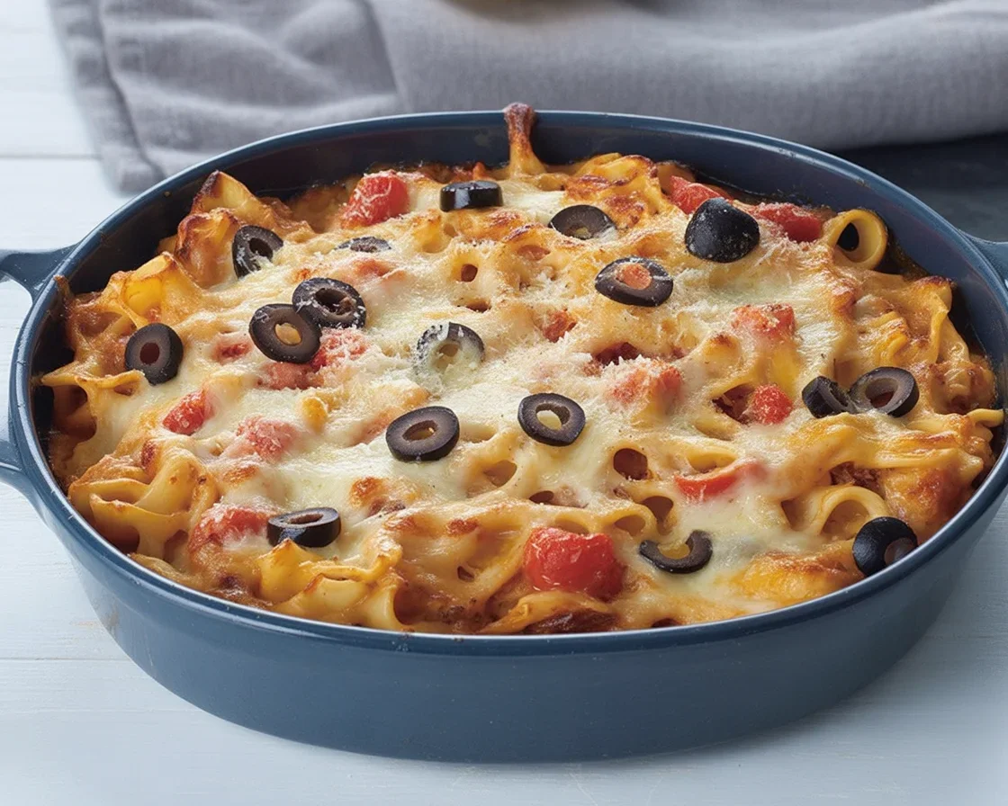 - Assemble: Pour into the baking dish, scatter olives and turkey pepperoni, then top with the remaining mozzarella and a tablespoon of Parmesan.