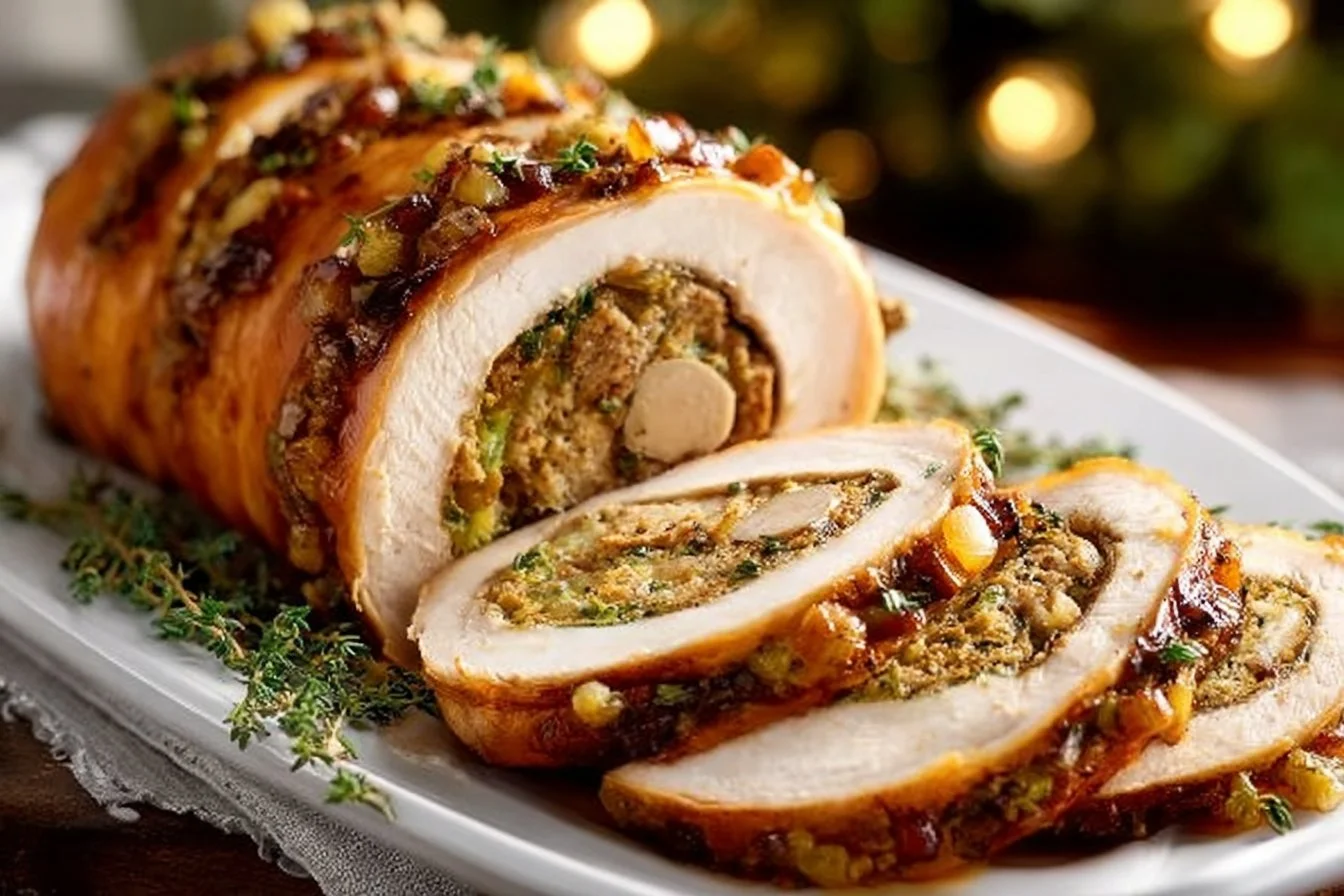 A cozy turkey roulade filled with savory sausage stuffing, ideal for Thanksgiving gatherings.